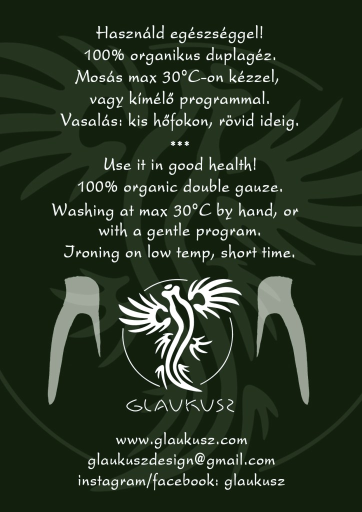 Használati utasítás, termék információk, mosási útmutató organikus duplagéz anyagból készült kapucnis sálakhoz: