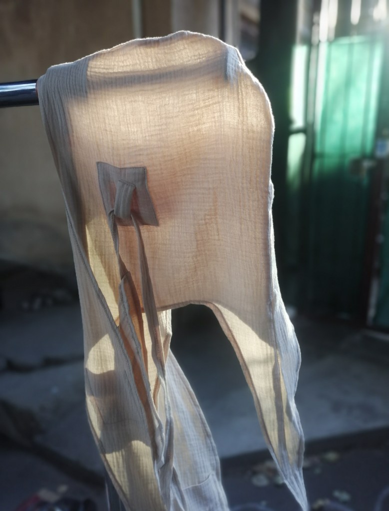 The ordered material arrived on June 3, and on June 9, Noya cut it from double gauze and sewed the first women’s hooded scarf. We figured out a way to attach the mask strap to the hood, and the mask prototype was also completed. Noya showed me how to cut a piece of fabric so that it would wave a little on its own. Even this solid piece with it’s edges sewed down impressed me, and it was wonderful to see the dream take shape under Noya’s hands.