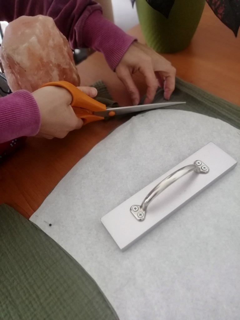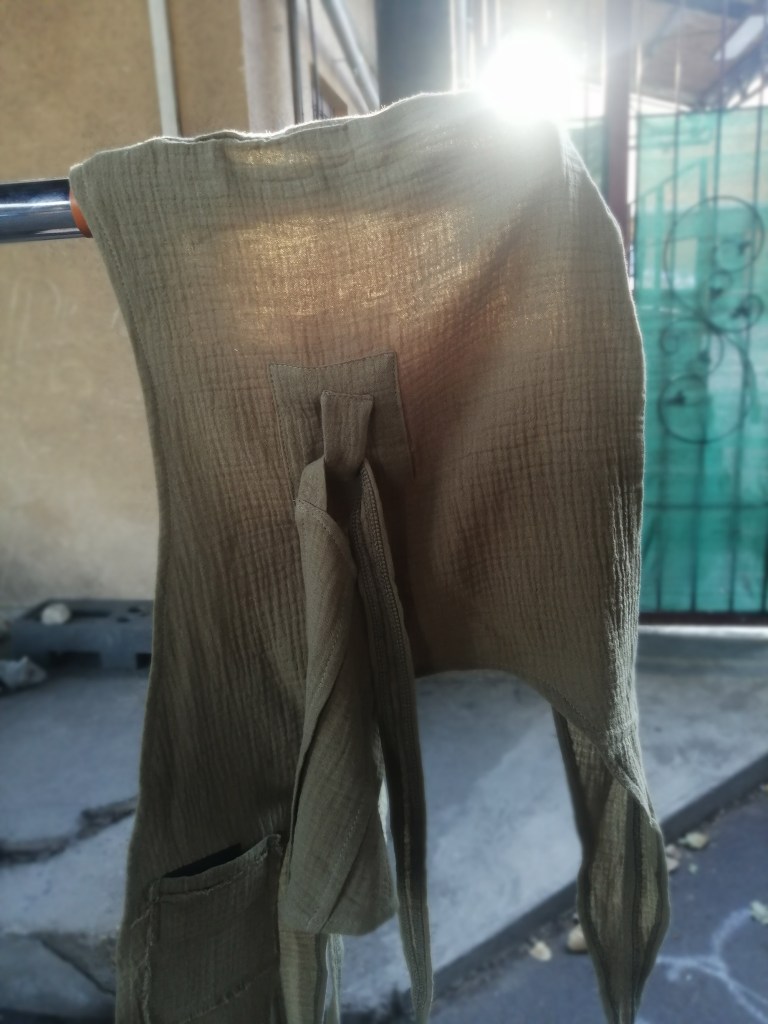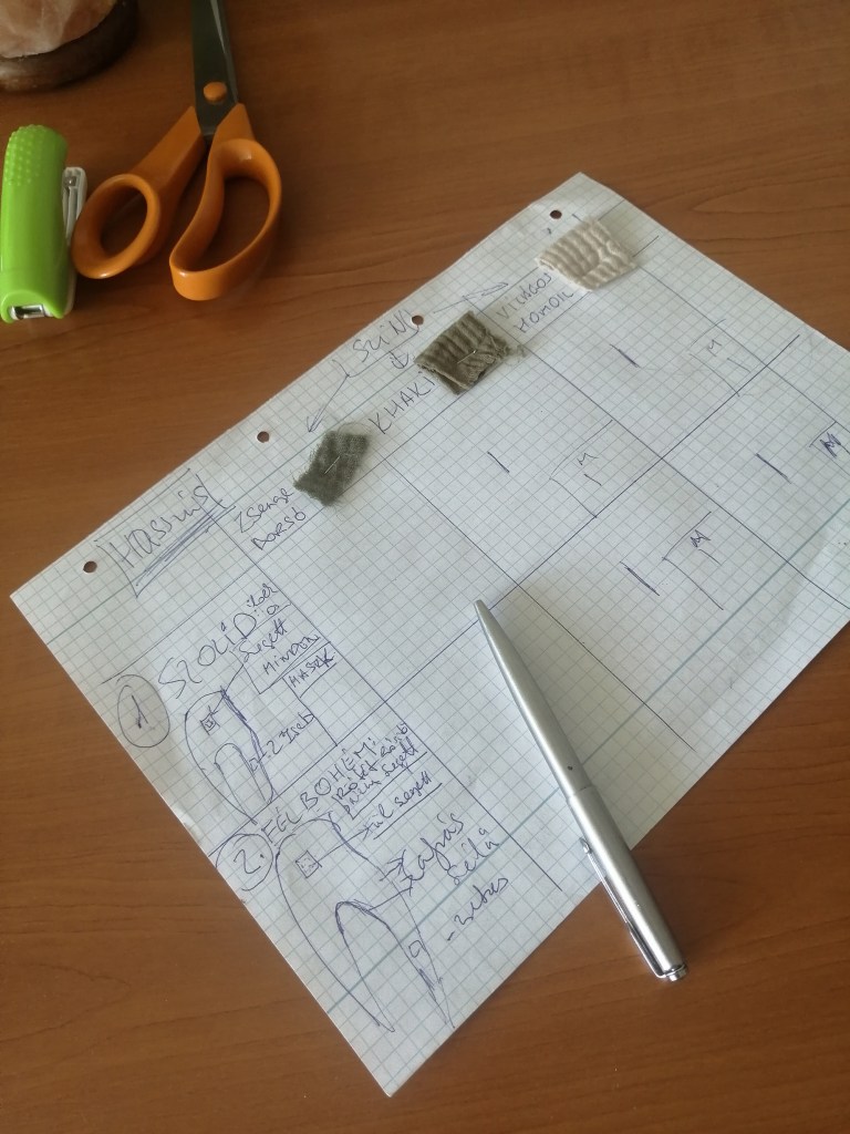 On May 24, we met again with Noya. I brought the basic sample made from the sheet, and she liked the idea and the design too. We made some minor adjustments, thickened the scarf, and Noya figured out that the hood and the “dragon tail” at the back could be cut from a single piece of fabric. She drew the pattern with markings and measurements and asked what material we would use to make it. I knew almost nothing about different fabrics, I just had the idea that I wanted natural colors and materials. So, on May 29, we went to a large fabric store where they showed us lots of different fabrics. We could look at them and touch them, and a whole new world opened up for me, but I immediately liked the fabric and structure of the double gauze. After thinking it over at home, I had a pretty clear feeling that a chemical-free raw material would be good, so in the end, I chose organic double gauze, which is soft and breathable, environmentally and skin-friendly, and it also became clear that I would not be printing this fabric, because with its ribbed texture, it is perfect on its own. At first, I liked the color of the tender pea the most, which is a pleasant, natural mix of brown and green. I only wrote down the exact dates so you could see the pace at which we worked, because from this point on, things started to move quickly. It turned out that Noya will work a lot, so she wouldn’t be available from the summer onwards.