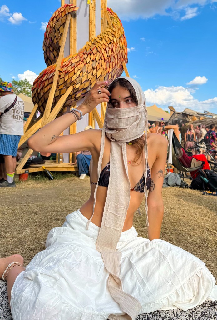 At the end of summer, the wonderful Eszter sent me some fantastic photos of her taken at the festival, in a completely authentic setting, with vivid colors. She also chose light sand color, but she chose the Solid version with stitched edges.