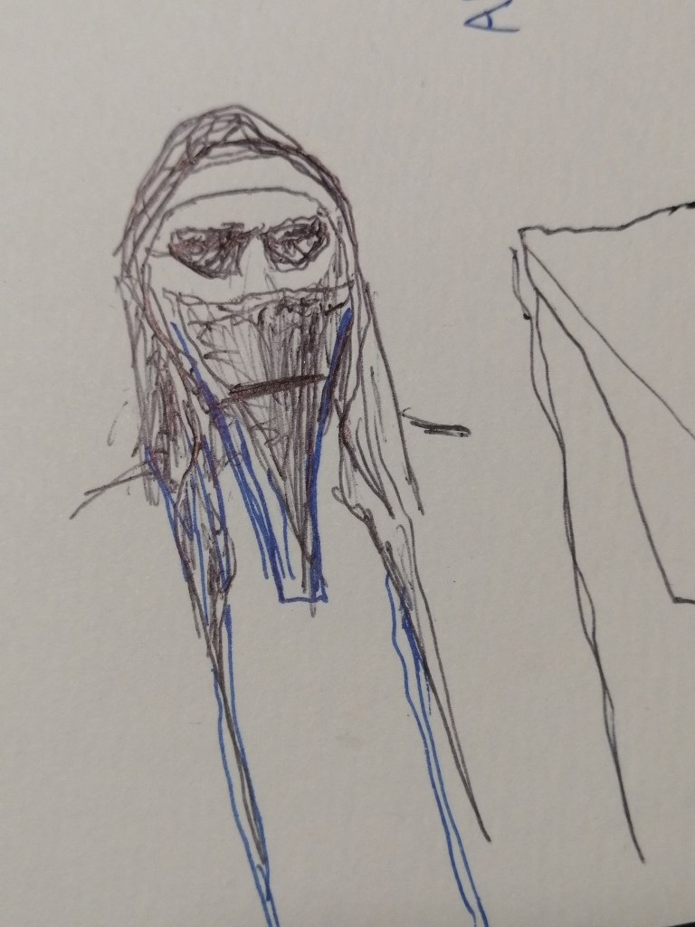 During April and May, I drew a lot, and in the meantime, the shape took form, the name matured, and the idea became more refined. I decided to make the women’s variant first. I cut the shape out of a sheet, sewed it together with my minimal sewing skills, and tried it on the refrigerator in the kitchen with a paper towel head. And even so, I thought it looked good; at least I could already see in it what I had dreamed of.
