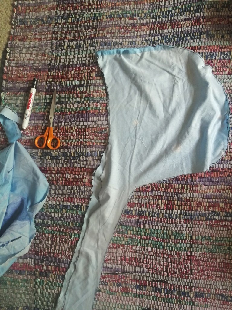 I thought a lot about how to keep costs down, and finally decided to leave out the sweater part, which would require a lot of fabric, and focus only on the hooded scarf or scarfed hood, which will be a separate garment, and make an attachable mask to go with it.