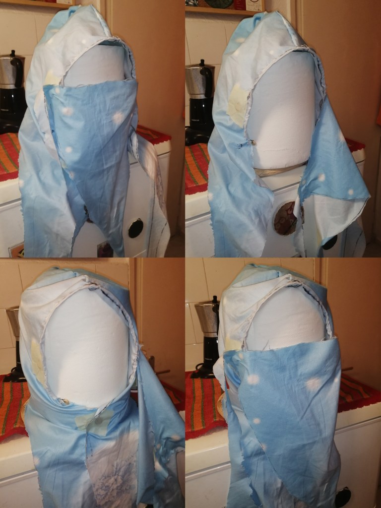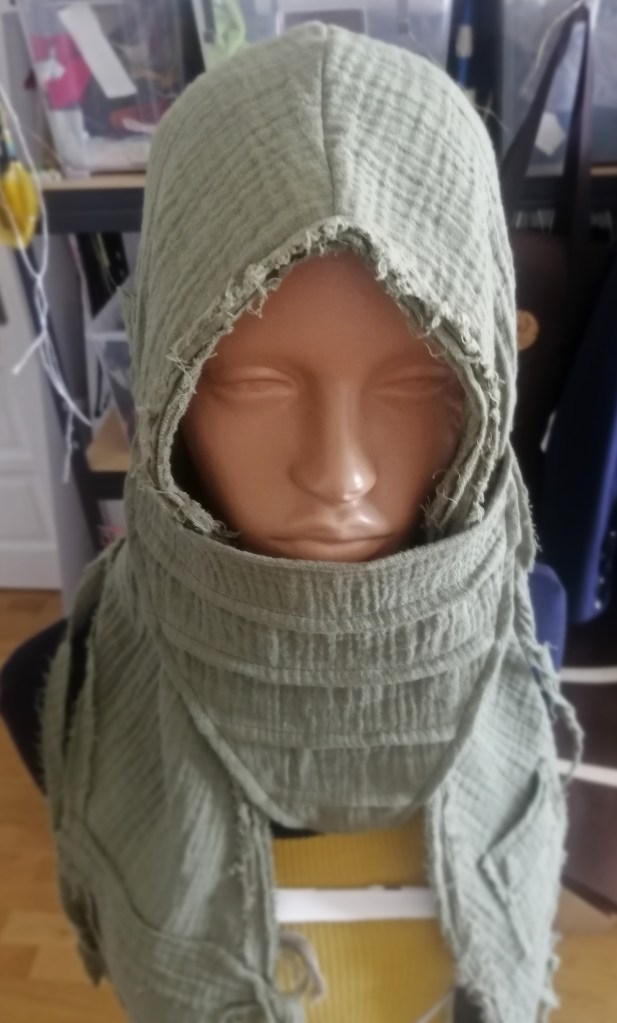 Június 3.-án megérkezett a rendelt anyag, 9.-én pedig Noya kiszabta duplagézből és megvarrta az első női kapucnis sálat, kitaláltuk a maszk pántjának bujtatós megoldását a kapucnihoz, és a maszk prototípusa is elkészült. Noya megmutatta, hogyan kell kiszabni egy anyagrészt ahhoz, hogy önmagában hullámosodjon egy kicsit. Már ez a levarrt szegélyű, visszafogott darab is lenyűgözött, csodás érzés volt látni, hogy Noya kezei alatt valósággá formálódik az álom.
