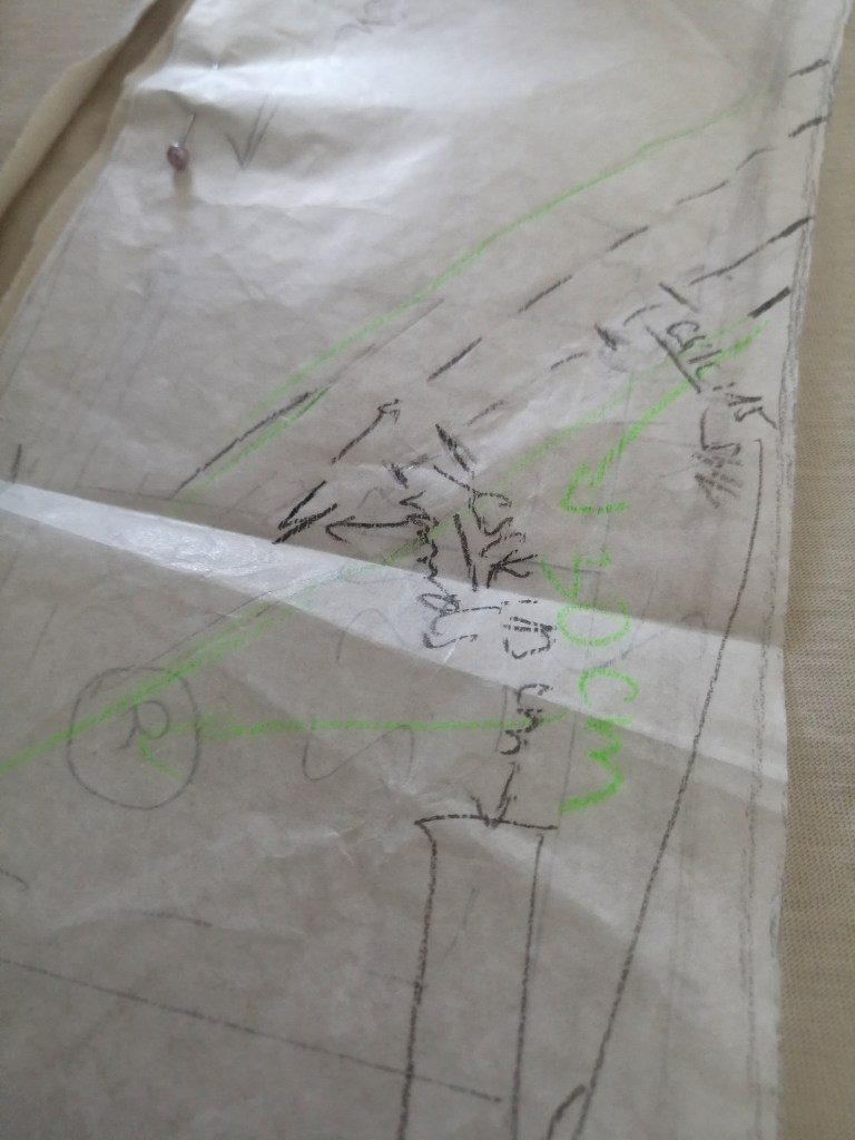 Május 24.-én találkoztunk újra Noyával, vittem a lepedőből készült alapmintát, neki is tetszett az ötlet és a vonalvezetés is. Kis módosításokat végeztünk, megvastagítottuk a sálat, Noya kitalálta, hogy lehet a kapucni és a hátulján lévő “sárkányfarok” egy anyagrészből kiszabva. Felrajzolta a szabásmintát jelölésekkel, méretekkel és megkérdezte, hogy milyen anyagból fogjuk készíteni. Én nagyjából semmit nem tudtam a különböző textilekről, csak annyi elképzelésem volt, hogy természetes színeket és alapanyagot szeretnék. Ezért május 29.-én elmentünk egy nagy textilkereskedésbe, ahol megmutattak rengeteg féle anyagot, meg lehetett őket nézni, fogni, egy új világ nyílt számomra, de a duplagéz anyaga, struktúrája egyből megtetszett. Otthon átgondolva, elég egyértelmű érzésem támadt, hogy vegyszermentesen előállított alapanyag lenne jó, így végül az organikus duplagéz anyag lett a választás, ami puha és légáteresztő, környezet- és bőrbarát, valamint az is nyilvánvalóvá vált, hogy nem mintázom ezt az anyagot, mert ezzel a bordázottsággal önmagában is tökéletes. Első körben a zsengeboró szín volt a legszimpatikusabb, ami a drapp és a zöldes szín kellemes, természetes hatású keveréke. Csak azért írtam pontos dátumokat, hogy lássátok, milyen ütemben készítettük el, mert innentől felgyorsultak az események. Kiderült, hogy Noya sokat fog dolgozni, így nyártól nem fog ráérni.