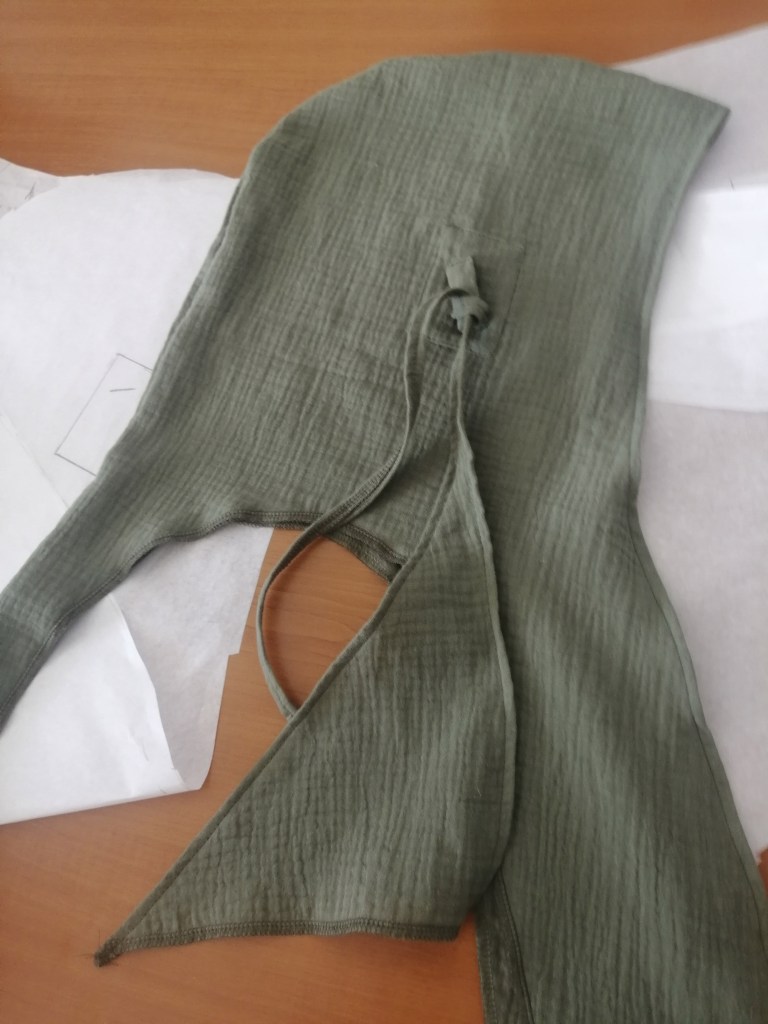 I redesigned the mask at home, wanting it to be more than just a simple accessory, but an integral part of the whole, and at least as imaginative as the hooded scarf. So I cut out small sewed strips and tried them on the prototype of the mask, that I could show my idea to Noya, which immediately made it fit much better in terms of style. We finished it on June 25, and at Noya’s suggestion, we added more strips using a technique called Pié stitching, which made it look even better. The color selection was expanded to three: in addition to tender pea green, there was now moss green and light sand.