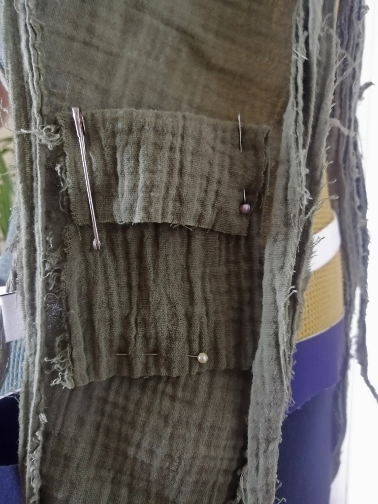 However, I missed the cool, hanging fringes, so we decided to keep this version, but also make a wilder one. On June 13, we worked for nine hours straight. Imagine, we didn’t eat or drink, we worked in a real creative vibe, our creative energies resonated, we came up with the wild version, the location of the small pockets and hanging fringes. Noya showed me how to make the edges fringed, but still have everything sewn down so that it wouldn’t unravel later. Finally, although everything was still held in place with safety pins, the wild version was finished, much to my delight.