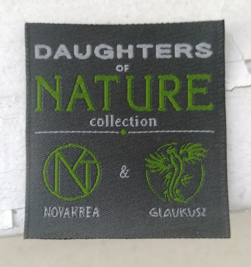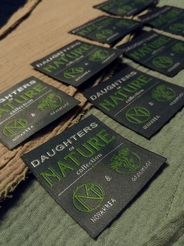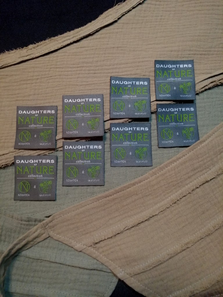 Miután eldőlt, hogy egyelőre csak női változatokat készítünk, az elnevezés ‘Daughters of Nature – Természet Lányai’ lett, így megterveztem a címkét és leadtam a rendelést prémium szövött, damaszt anyagból készült címkékre, 5×5 cm méretben. Június 20.-án finiseltük a vad változatot, plusz elkészítettük a kapucni harmadik változatát, ami átmenet lett a visszafogott és a vad között. A változatok nevei is megszülettek, SZOLÍD lett, aminél a széleket leszegtük, az átmenetes lett a SZELÍD, aminél a szegélyek rojtozottak, és a harmadik lett a BOHÉM, aminél pedig minden szegély rojtozott és plusz rojtokat is varrtunk rá a vadabb kinézetért.